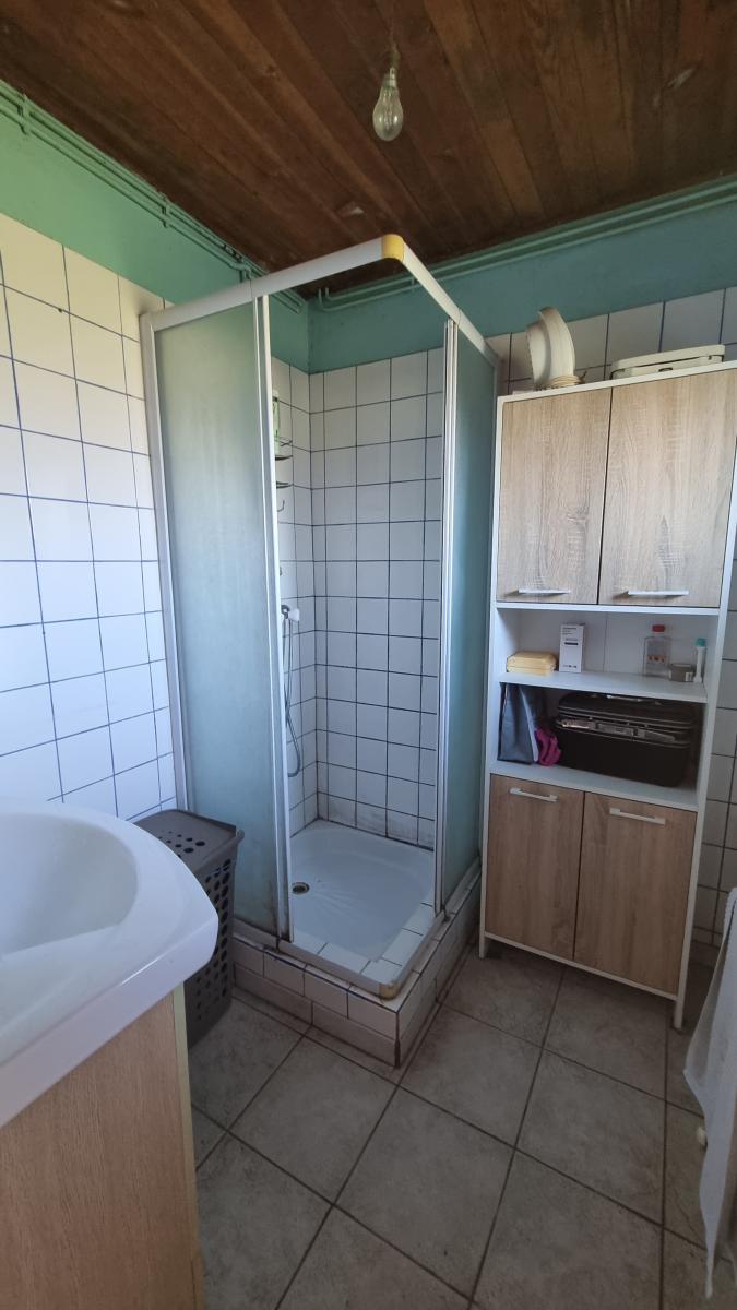 Au rez-de-chaussée : cuisine, salle de bains, wc, salle, salon avec cheminée.